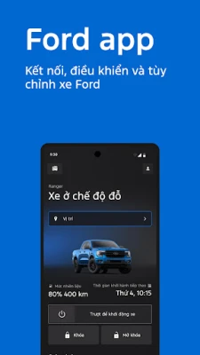 Ford App giúp nâng tầm mọi hành trình cùng Ford. Ứng dụng duy nhất này cung cấp quyền truy cập vào các tính năng tiện lợi như khởi động từ xa, khóa và mở khóa, xem thống kê xe và theo dõi GPS, tất cả đều miễn phí.